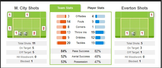 Sau nhiều pha lên bóng nguy hiểm, đội chủ nhà cũng có bàn thắng thứ 3 từ chấm 11m ở phút 69 trong trận gặp Everton. Sau khi Zabaleta bị Coleman phạm lỗi trong khu vực 16m50, Man City được hưởng quả penalty. Trên chấm phạt đền, Aguero suýt chút nữa làm đội nhà mất một bàn thắng. Sau khi trúng cột dọc, bóng đập người thủ môn Tim Howard bay vào khung thành.