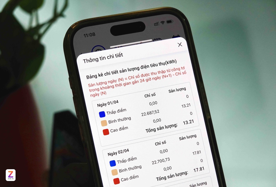 Màn hình kiểm tra mức tiêu thụ điện theo khung giờ trên ứng dụng EVNHCMC. |