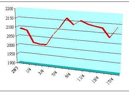 Từ đầu tuần, giá kỳ hạn đi xuống, cú giật cuối tuần giúp giá lên và bù lại những gì đã mất một cách chóng vánh. Đóng cửa phiên cuối tuần 17/4, giá kỳ hạn robusta London chốt mức 2.136 đô la Mỹ/tấn, mất 6 đô la so với cuối phiên thứ Sáu 11/4 (xin xem biểu đồ trên). Cũng thời gian này, giá arabica tăng 0,55 cts/lb hay 12 đô la/tấn.