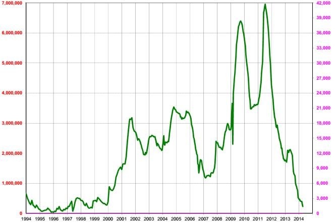 Với nhịp điệu mua bán khá đều đặn như thế, khối lượng cà phê xuất khẩu của nước ta trong tháng 3/2014 theo thống kê của Tổng cục Hải quan đạt mức 278.252 tấn, tương đương với 4,64 triệu bao (60 kg x bao), tăng 76% so với 158.055 tấn cùng kỳ năm ngoái. Đây được xem là mức xuất khẩu cà phê của một nước trong một tháng cao kỷ lục từ cổ chí kim, từ đông sang tây. Vì ngay cả Brazil, nước xuất khẩu cà phê số 1 thế giới, thị trường chỉ ghi nhận tháng có lượng xuất khẩu kỷ lục của mọi thời đại ở mức 3,49 triệu bao vào tháng 10/2010.
