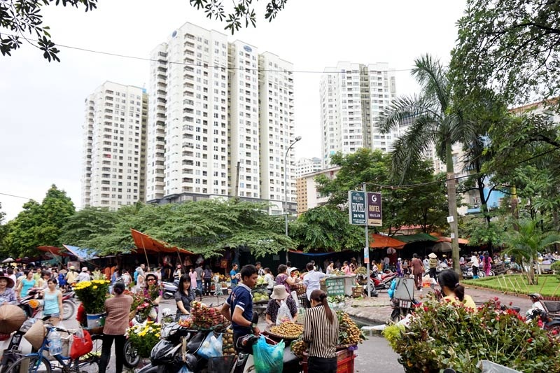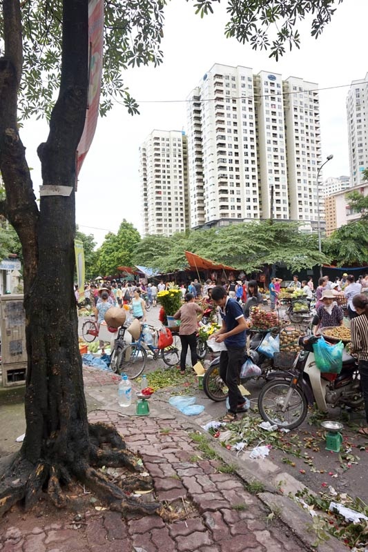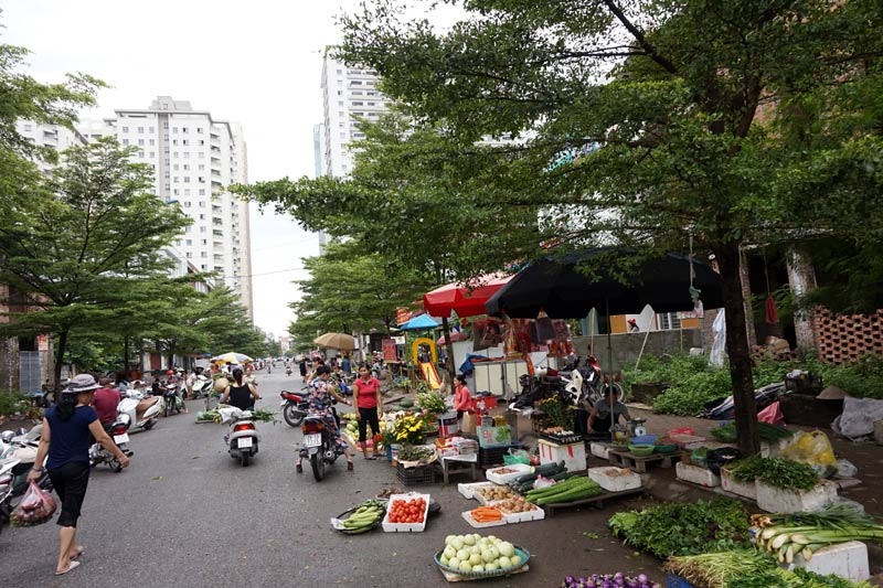 | Chợ họp giữa lòng các con đường trong khu Trung Hòa- Nhân Chính cản trở giao thông, rác rưởi xả xuống đường rất mất vệ sinh. |