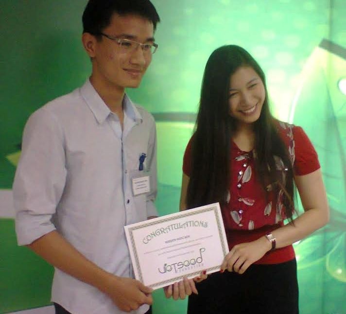 | 9X ăn mặc giản dị, trao học bổng cho các học sinh trong hội VietSeed Hà Nội - Sài Gòn. |