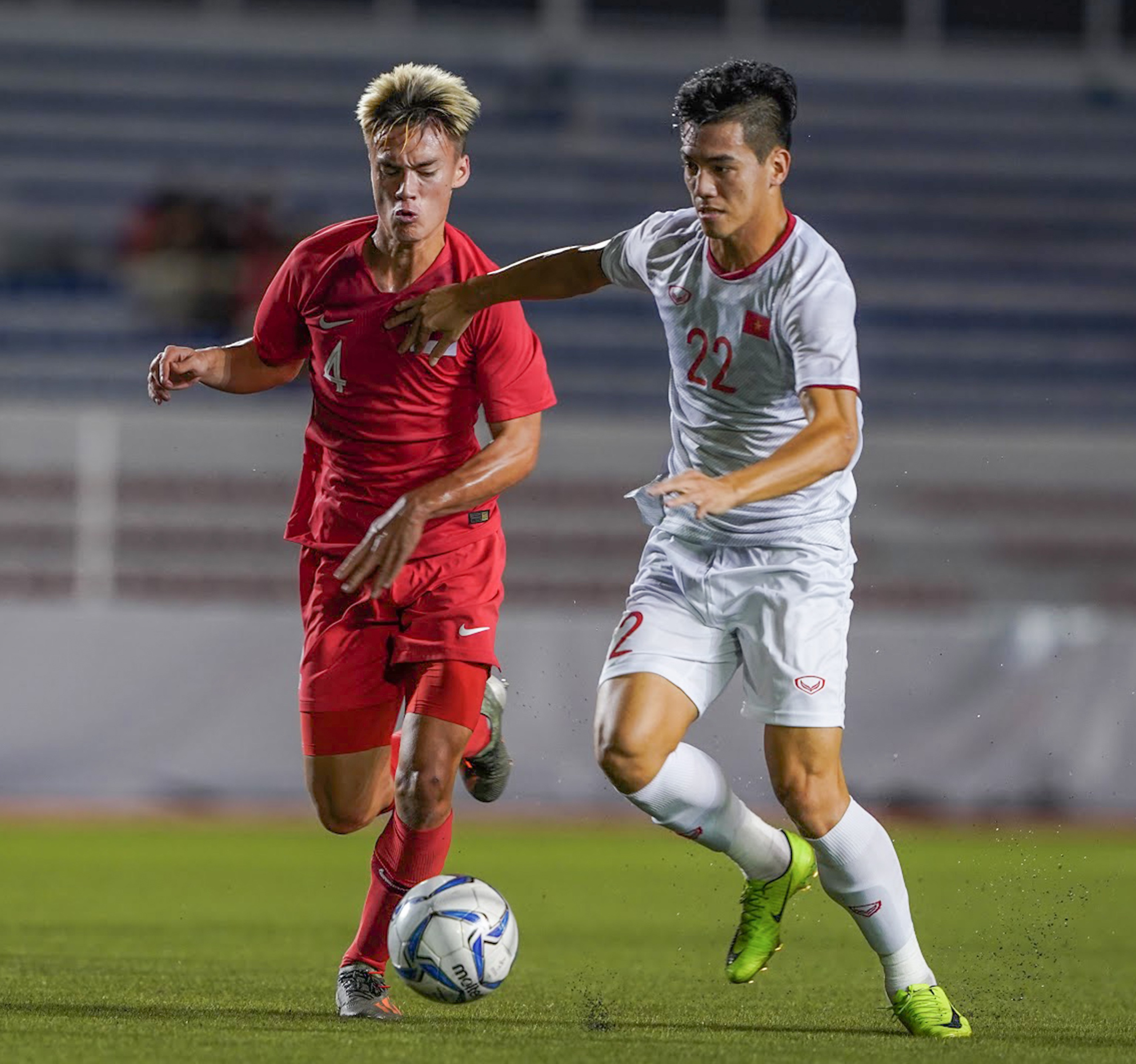 | Ryhan Stewart (trái) của U23 Singapore ấn tượng mạnh với sự chắc chắn của bộ ba Thành Chung, Đức Chiến và Ngọc Bảo ở lần đối đầu tại vòng bảng SEA Games 30. Ảnh: Việt Linh. |