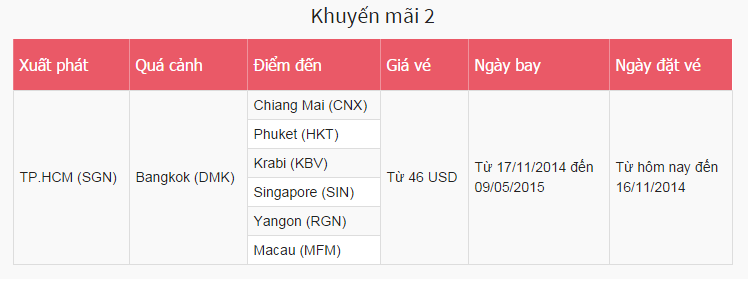 Trong chương trình này, Air Asia đã áp dụng giảm giá vé cho nhiều chuyến bay đến các địa điểm du lịch nổi tiếng và hấp dẫn như: Chiang Mai, Phuket, Yangon, Macau, Singapore. Với giá vé chỉ từ 46 USD, đây là cơ hội để mọi người có được vé máy bay đi Thái Lan giá rẻ để đặt chân đến khám phá hai thành phố du lịch nổi tiếng là Chiang Mai và Phuket. Chương trình khuyến mãi kéo dài đến ngày 16/11 hoặc có thể kết thúc sớm hơn nếu lượng vé khuyến mãi được bán hết.
