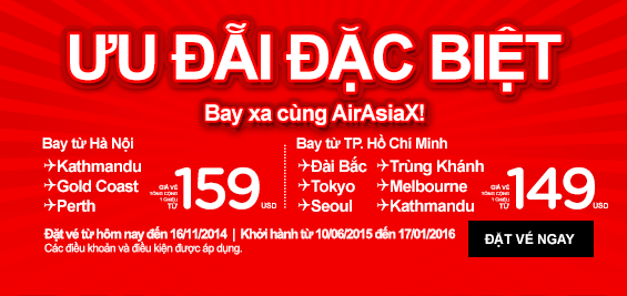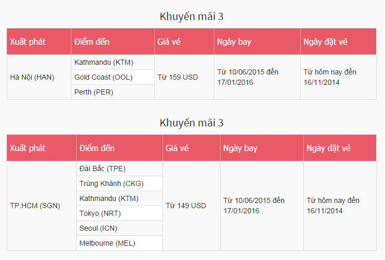 Chương trình khuyến mãi này áp dụng cho cả các chuyến bay khởi hành từ Hà Nội và TP.HCM. Từ Hà Nội, mọi người có cơ hội sở hữu những chiếc vé máy bay đi Perth và Gold Coast với giá vé chỉ từ 159 USD. Còn tại TP.HCM, chương trình khuyến mãi áp dụng cho nhiều điểm đến hấp dẫn như: Đài Bắc, Trùng Khánh, Kathmandu, Tokyo, Seoul, Melbourne. Các chuyến bay trong chương trình khuyến mãi này khởi hành từ ngày từ 10/06/2015 và kéo dài đến 17/01/2016.