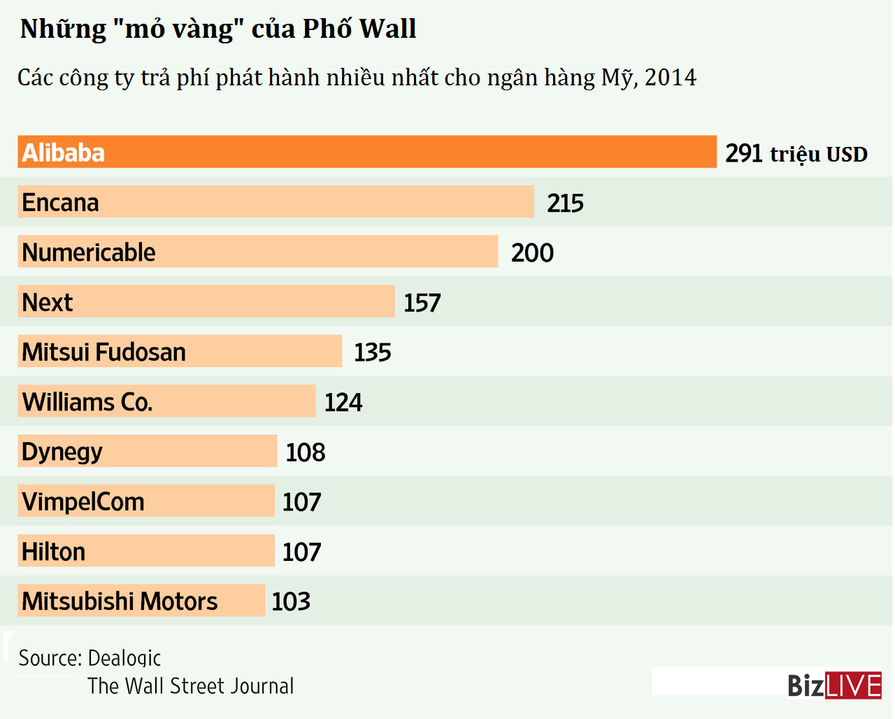 Mức phí này đưa Alibaba vượt lên nhiều tập đoàn hùng mạnh khách như công ty năng lượng Encana của Canada, công ty viễn thông Numericable của Pháp, công ty bất động sản Mitsui Fudosan của Nhật để trở thành khách hàng chi mạnh nhất trong các đợt phát hành năm 2014.