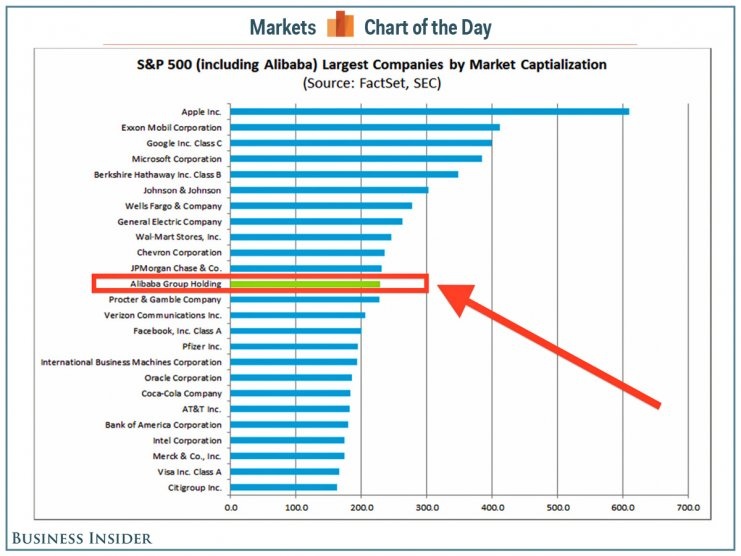 Tính theo giá cổ phiếu chốt phiên thứ Sáu, hiện Alibaba đang là công ty lớn thứ 15 trong rổ chỉ số S&P 500 theo giá trị thị trường, vượt trên nhiều công ty trụ cột ngành như Pfizer (193,9 tỷ USD), IBM (193,3 tỷ USD), và Coca-Cola (183,3 tỷ USD).
