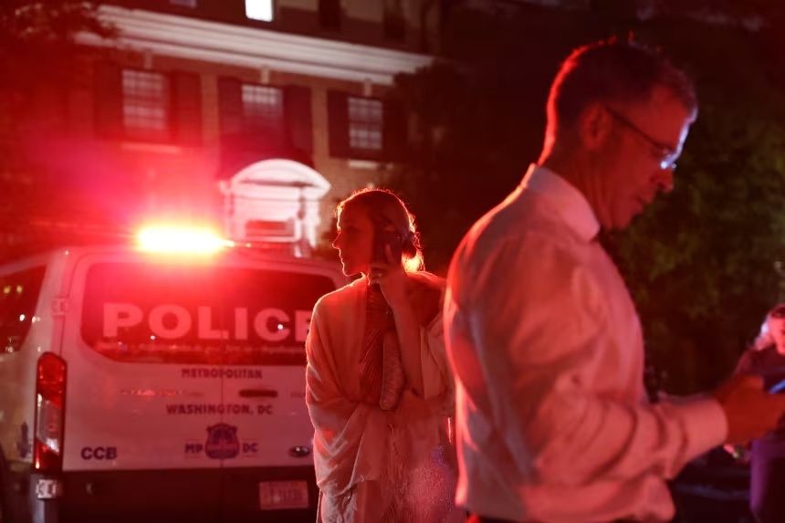 Erika Kirk, góa phụ của nhà hoạt động chính trị Charlie Kirk, bật khóc rời khỏi phòng tiệc của khách sạn Washington Hilton. Erika Kirk được nhân viên an ninh hỗ trợ sau khi bị chấn động tâm lý vì vụ nổ súng tại khách sạn.