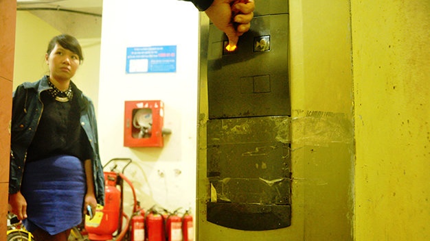 Người bảo vệ trên cho biết: “Thang máy ở đây thường xuyên bị kẹt cửa buồng, ban quản lý chung cư cho thợ sửa hoài cũng vậy. Khi có người bị kẹt gọi, chúng tôi đến chỉ cần bấm nút mở cửa thang bên ngoài là nó mở cửa”.