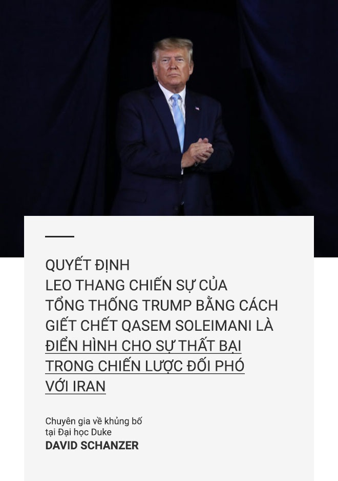 "Quyết định leo thang chiến sự của Tổng thống Trump bằng cách giết chết Qassem Soleimani là điển hình cho sự thất bại trong chiến lược đối phó với Iran của ông ấy", David Schanzer, chuyên gia về khủng bố tại Đại học Duke, nhận định.