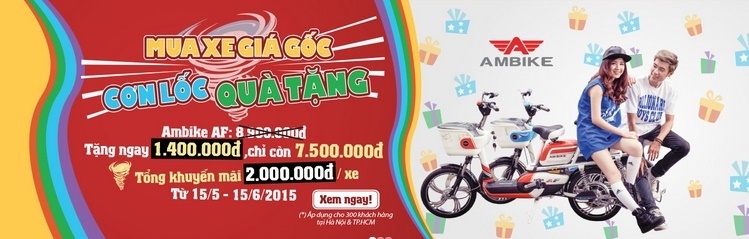 Từ ngày 15/5, tháng khuyến mãi tri ân khách hàng mang tên Mua xe giá gốc - Cơn lốc quà tặng của Ambike sẽ chính thức bắt đầu. Theo đó, người dùng tại Hà Nội và TP HCM khi mua xe Ambike sẽ được tặng ngay 1,4 triệu đồng, kèm theo một mũ bảo hiểm chính hãng Ambike với giá 250.000 đồng, một áo mưa Ambike trị giá 150.000 đồng và một voucher thay thế linh kiện 200.000 đồng. Tổng giá trị quà tặng lên đến 2 triệu đồng mỗi xe. Tuy nhiên, những ưu đãi lớn này chỉ áp dụng cho 300 khách hàng đầu tiên tới mua Ambike hoặc đặt hàng trước qua hotline của Ambike.