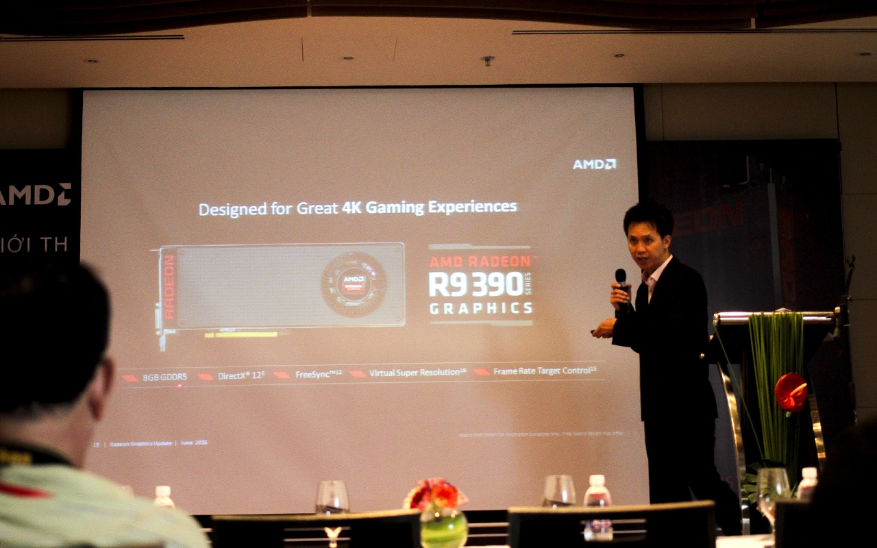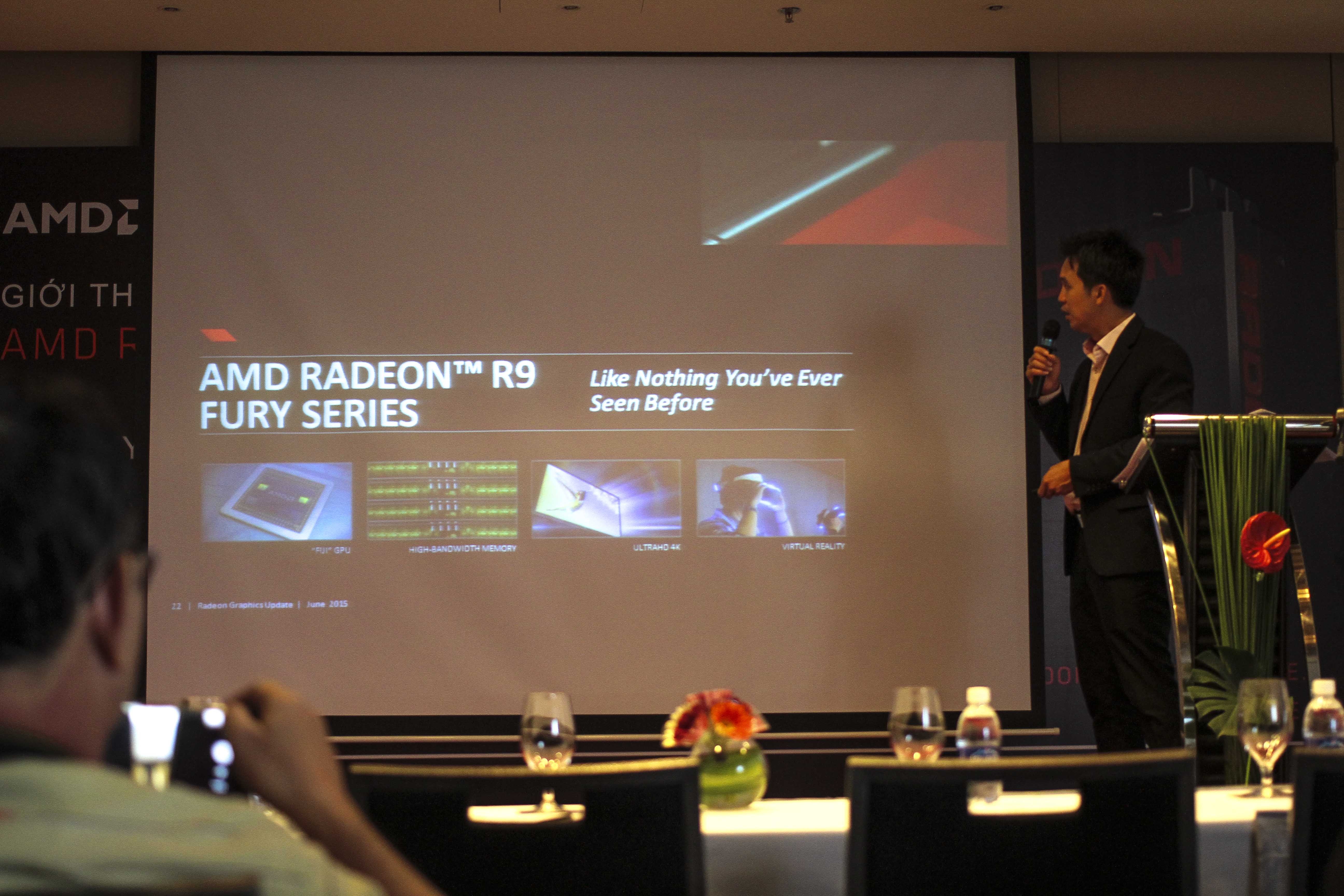 | Trong sự kiện ra mắt ở Việt Nam, ông Ryan Sim, Giám đốc bán hàng của ADM khu vực Châu Á cho biết, R9 Fury X GPU hiện là chip đồ họa có băng thông bộ nhớ cao nhất trên thế giới. Nó hỗ trợ tối ưu cho các thiết bị thực tế ảo VR. |