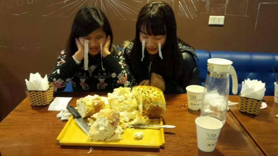 Hà Anh và Phương, 2 bạn nữ vừa thua cuộc chia sẻ, ban đầu nhìn chiếc bánh tưởng đơn giản lắm. Nhưng khi ăn đến 2/3 chiếc bánh thì có cảm giác đầy bụng và dạ dày như muốn nổ tung. "Có lẽ, sẽ rất lâu sau mình mới có thể ăn lại món này", Hà Anh cười nói.