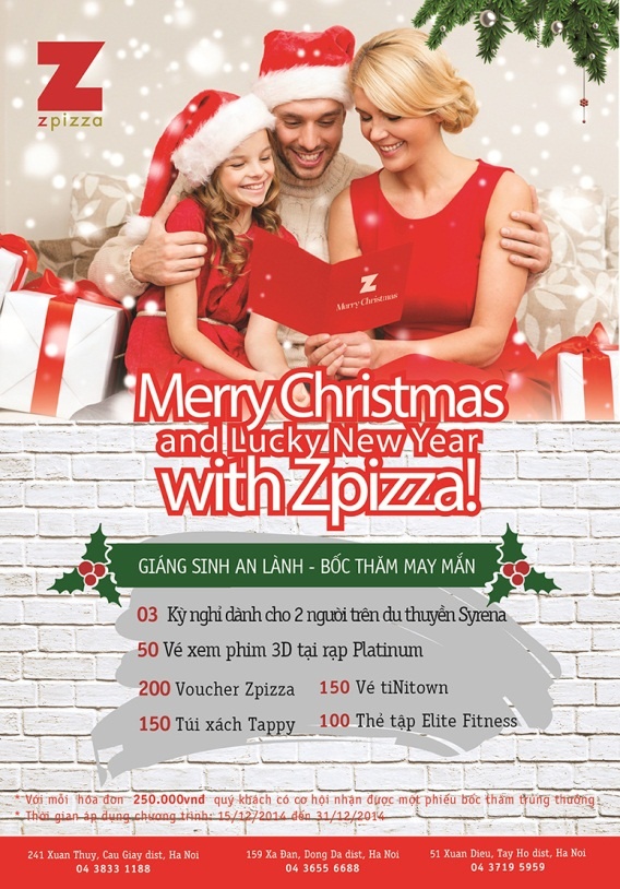 Sẽ rất thú vị khi vừa được thưởng thức những chiếc pizza tươi thơm phức, vừa có cơ hội trúng thưởng 100% trong sự kiện Bốc thăm may mắn - Giáng sinh an lành của thương hiệu Zpizza - thương hiệu pizza đến từ Mỹ nhân dịp lễ Giáng sinh và năm mới.