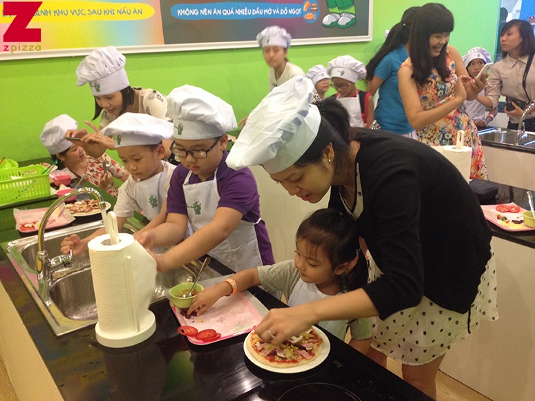 | Các đầu bếp nhí học làm bánh pizza. |