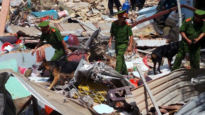 | Cơ quan chức năng đưa chó nghiệp vụ vào tìm xác thi thể 2 nạn nhân trong vụ nổ kinh hoàng ở công ty Đặng Huỳnh. |