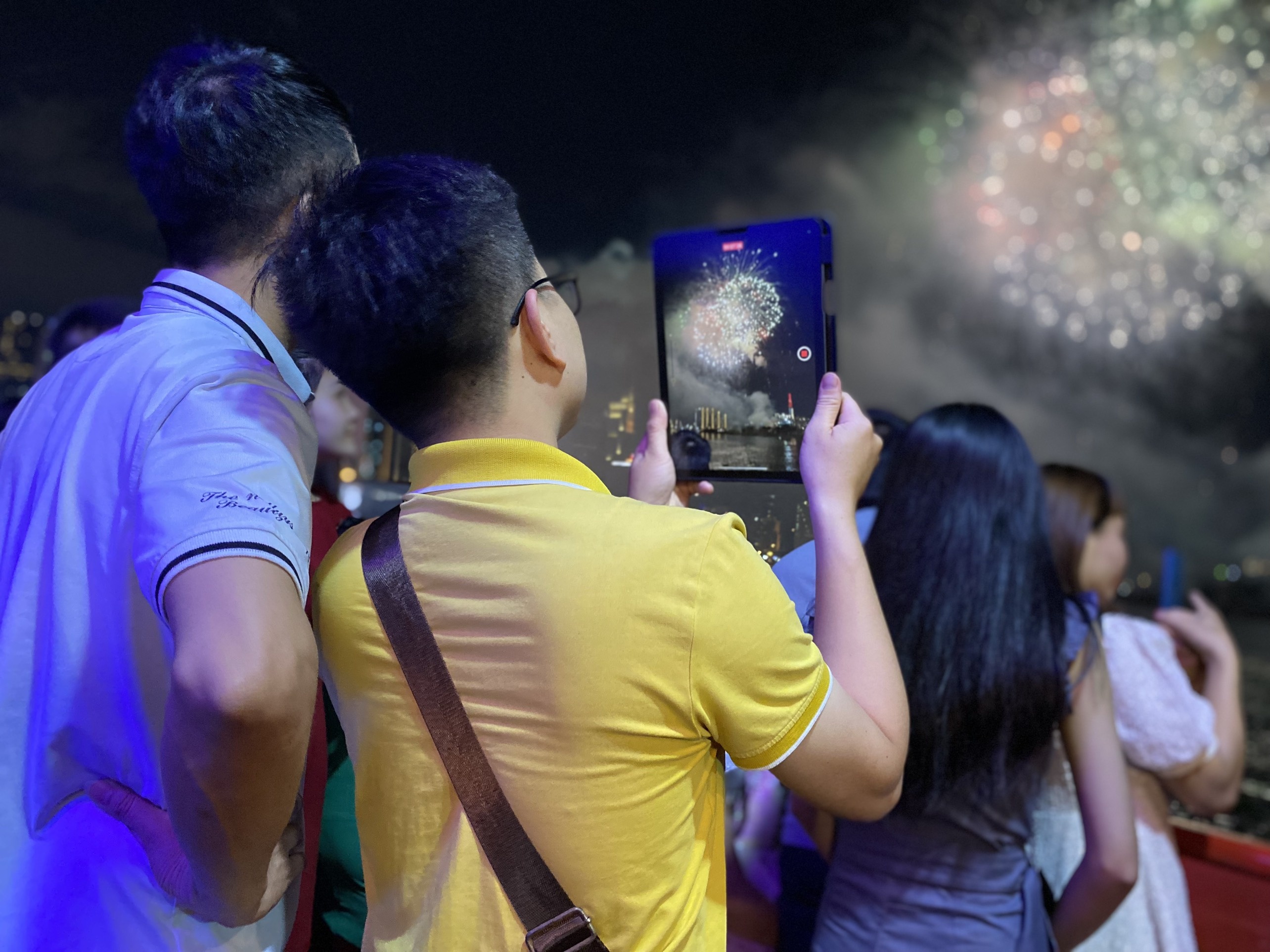 "Mình chọn tàu này bởi không gian rộng, đồ ăn ổn và không khí khá lãng mạn. Vừa có thể ăn uống, vừa được nhìn thành phố từ trên sông. Hôm nay ngày lễ nên tàu khá đông, dù vậy mọi người đều có vẻ thoải mái, háo hức khi được ngắm pháo hoa rực rỡ".