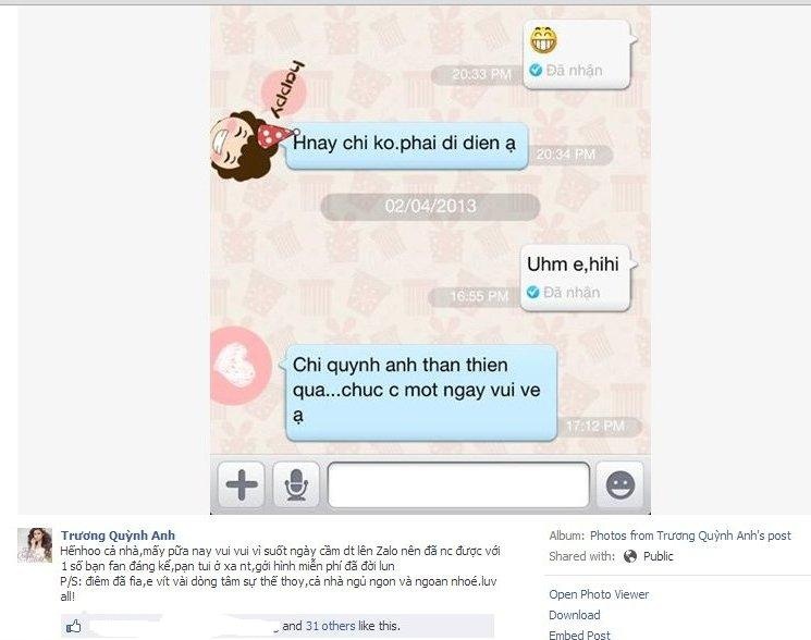 Ca sĩ Trương Quỳnh Anh vui vì nhờ Zalo trên điện thoại mà cô nói chuyện được với nhiều fan hơn mỗi ngày, nhắn tin xả láng với bạn bè ở xa. Sau một thời gian ra mắt, Zalo tiếp tục cung cấp thêm dịch vụ gọi điện thoại miễn phí, giúp chinh phục thêm nhiều nghệ sĩ tham gia vào hàng ngũ thành viên sử dụng.