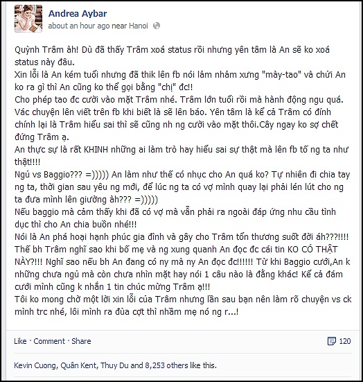 Trong chia sẻ trên trang cá nhân, Andrea tỏ ra khá thẳng thắn khi cho biết dù kém tuổi Quỳnh Trâm nhưng vì bà xã của Baggio đã "lên Facebook nói lảm nhảm, xưng "mày - tao" và chửi An không ra gì thì An cũng không thể gọi bằng "chị" được". Không dừng ở đó, chân dài 9X cũng nhấn mạnh cựu du học sinh sinh năm 1987 này "lớn tuổi mà hành động ngu quá". Cô phân tích: "Vác chuyện lên viết trên Facebook khi biết là sẽ lên báo, yên tâm là kể cả Trâm có đính chính lại là hiểu sai thì nhiều người cười vào mặt thôi".