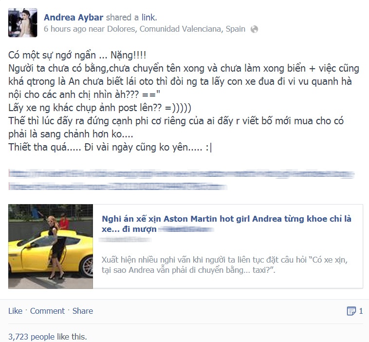 Cách đây không lâu, có thông tin cho rằng: "Nghi án xế xịn Aston Martin hot girl Andrea từng khoe chỉ là xe… đi mượn" và ngay lập tức hot girl này đã đáp trả trên trang cá nhân bằng đoạn chia sẻ khá dài: "Có một sự ngớ ngẩn... Nặng!!!! Người ta chưa có bằng, chưa chuyển tên xong và chưa làm xong biển cộng với việc cũng khá qtrong là An chưa biết lái ô tô thì đòi người ta lấy con xe đưa đi vi vu quanh Hà Nội cho các anh chị nhìn à??? Lấy xe người khác chụp ảnh post lên?? Thế thì lúc đấy ra đứng cạnh phi cơ riêng của ai đấy rồi viết bố mới mua cho có phải là sang chảnh hơn không. Thiết tha quá... Đi vài ngày cũng không yên...".