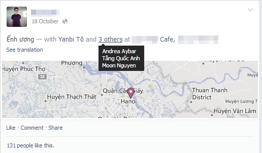 | Tên của Andrea bất ngờ xuất hiện trong status của một người bạn, và địa điểm của họ là một quán cafe tại Hà Nội. |