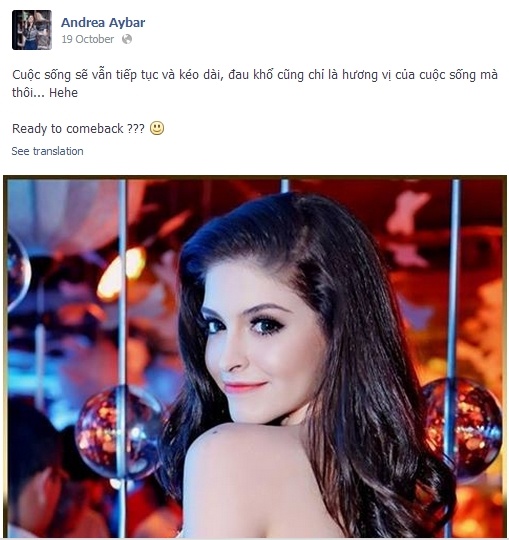 Sau đó 1 ngày, Andrea đã đăng tải trên trang cá nhân một bức ảnh cùng dòng bình luận nhiều ẩn ý: "Cuộc sống sẽ vẫn tiếp tục và kéo dài, đau khổ cũng chỉ là hương vị của cuộc sống mà thôi... Hehe. Ready to comeback?".