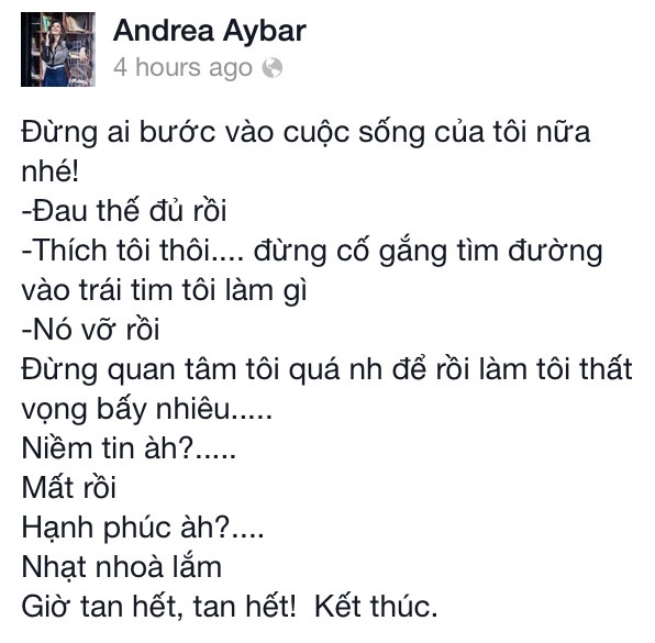 Tuy nhiên có vẻ như sau quãng thời gian gần 1 tháng nghỉ ngơi tại Tây Ban Nha, Andrea vẫn khá mệt mỏi khi tiếp tục đăng status đầy tâm trạng để nói về chuyện tình cảm của mình vào tối qua (20/10).