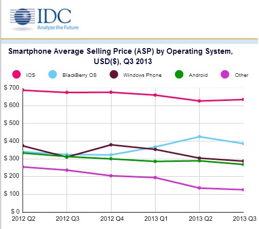 | Phân khúc giá trung bình của các hệ điều hành di động. |