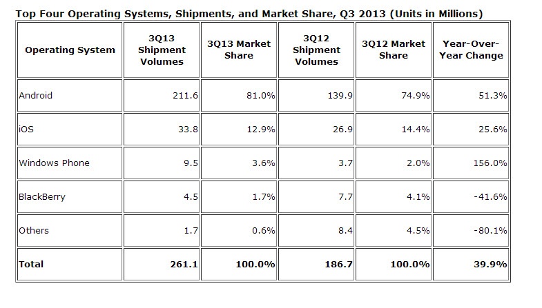 BlackBerry là một “đế chế” di động đang dần sụp đổ. Theo số liệu của công ty nghiên cứu thị trường IDC, Android tiếp tục củng cố ngôi vương của mình trong thị trường điện thoại thông minh, chiếm đến 81% số lượng điện thoại thông minh bán ra trong quý thứ ba của năm 2013.