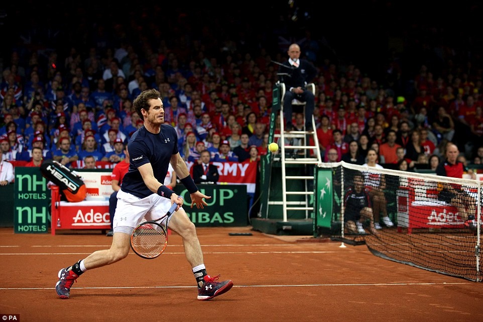 | Andy Murray là người giành chiến thắng cuối cùng khi đánh bại đối thủ người Bỉ David Goffin với tỷ số các set là 6-3, 7-5 và 6-3, qua đó giúp ĐT Vương quốc Anh giành chiến thắng trước ĐT Bỉ với tổng tỉ số 3-1. Ảnh: PA. |
