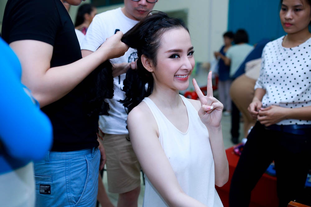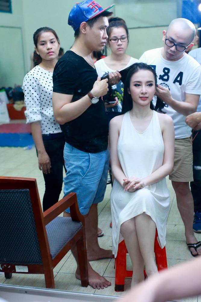 | Là khách mời nhảy cùng kiện tướng dancesport Hồng Việt trong đêm bán kết BNHV, Angela Phương Trinh có mặt tại hậu trường của chương trình vào khoảng 22h. Cô tất bật cùng ê-kíp chuẩn bị make up, thay trang phục... trước giờ lên sóng. Đây là lần đầu tiên "bà mẹ nhí" xuất hiện trên sóng truyền hình trực tiếp sau khi bị cấm diễn nửa năm. |
