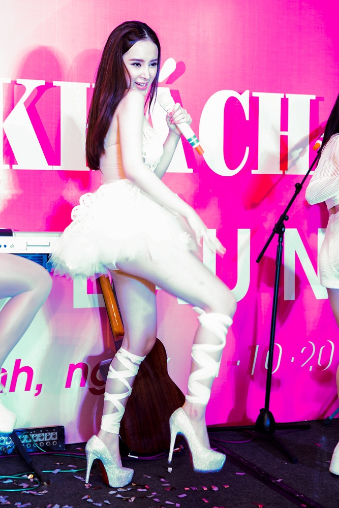 | Angela Phương Trinh diện váy sexy, vừa hát vừa nhảy bốc lửa một ca khúc mới của cô tại buổi tri ân khách hàng mà thương hiệu do cô làm đại sứ tổ chức. Thời gian này, bà mẹ nhí chủ yếu tập trung luyện tập khiêu vũ cho cuộc thi Bước nhảy hoàn vũ. Cô cũng đang mong muốn tìm được một kịch bản phim hay để tái ngộ khán giả. |