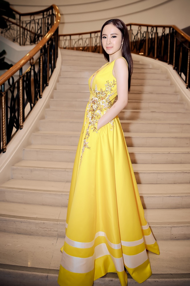 | Angela Phương Trinh được stylist Đỗ Long tháp tùng đến sự kiện. Cô diện chiếc đầm màu vàng nổi bật, trẻ trung, thiết kế đơn giản của NTK Lê Thanh Hòa. Phần thân váy được thêu họa tiết cùng màu sắc trang nhã với váy. |