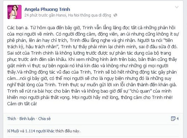 Chỉ vài phút sau khi đăng tải về sự cố trang phục phản cảm, dòng chia sẻ của cô nhận được hơn ngàn lượt “like”. Theo đó, người đẹp thị phi cho rằng cô vẫn lẳng lặng lắng nghe những ý kiến phản hồi của khán giả về mình. Angela Phương Trinh thừa nhận mình sai và hứa sẽ bỏ hết những động tác vũ đạo phản cảm như uốn éo, múa cột hát, bò trên sân khấu.