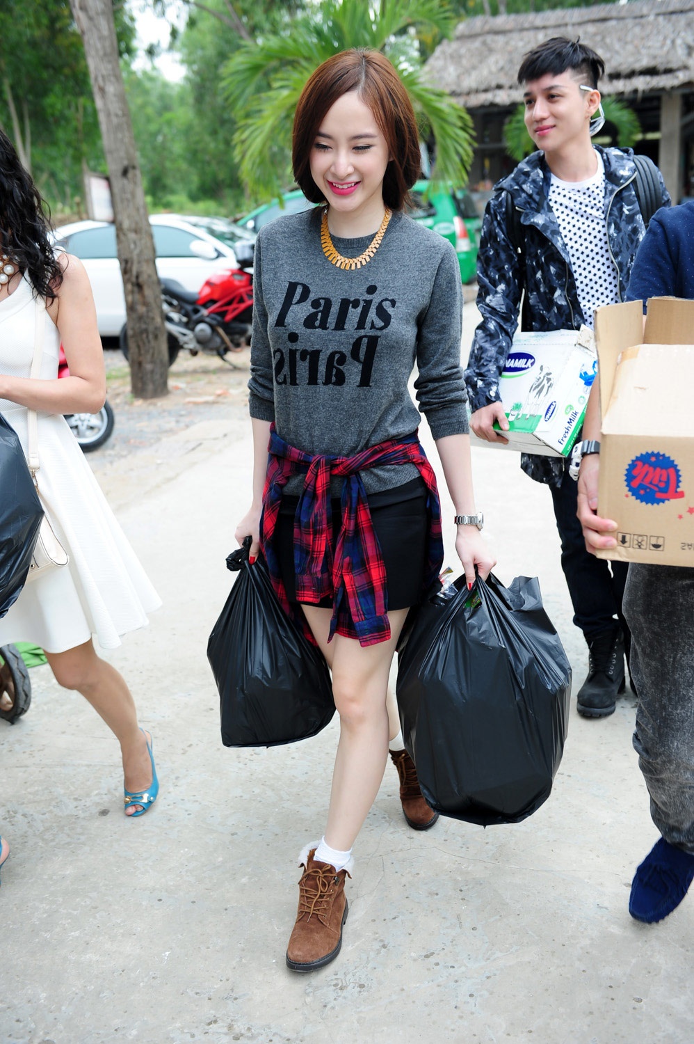 | Bà mẹ nhí ăn mặc giản dị, trẻ trung và xách từng túi quà cho các em nhỏ. Cô cho biết luôn cảm thấy hạnh phúc trong lòng mỗi khi làm một việc ý nghĩa khiến người khác vui vẻ. Sau khi Phương Trinh mua chiếc xế hộp thứ hai, khá nhiều khán giả bình luận rằng, cô xài tiền phung phí hay nên làm từ thiện vì có rất nhiều mảnh đời khó khăn trong cuộc sống. Khi được hỏi, đây có phải lý do khiến ngày hôm nay cô đi phát quà, Phương Trinh phủ nhận. |