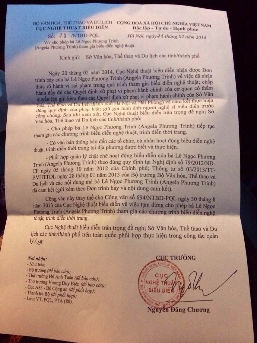 Sau nhiều ồn ào và tranh cãi về việc biểu diễn trở lại Angela Phương Trinh sau gần 6 tháng bị cấm trong những ngày qua, chiều 21/2, nữ diễn viên Tiểu thư đi học đã nhận được công văn được cấp phép biểu diễn trở lại có chữ ký của Cục trưởng Nguyễn Đăng Chương.