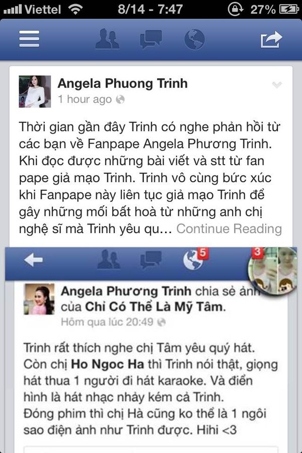 Mới đây, một trang tin đã đăng tải bài viết với nội dung: "Angela Phương Trinh vượt mặt chê Hà Hồ". Theo đó, lấy dẫn chứng từ một fanpage được cho là của Angela Phương Trinh với những lời nhận định về giọng hát của Hồ Ngọc Hà theo hướng tiêu cực: “Trinh rất thích nghe chị Tâm yêu quý hát. Còn chị Hồ Ngọc Hà, Trinh nói thật, giọng hát thua một người đi hát karaoke. Và điển hình là hát nhạc nhảy kém hơn cả Trinh. Đóng phim thì chị Hà cũng không thể là một ngôi sao điện ảnh như Trinh được”.
