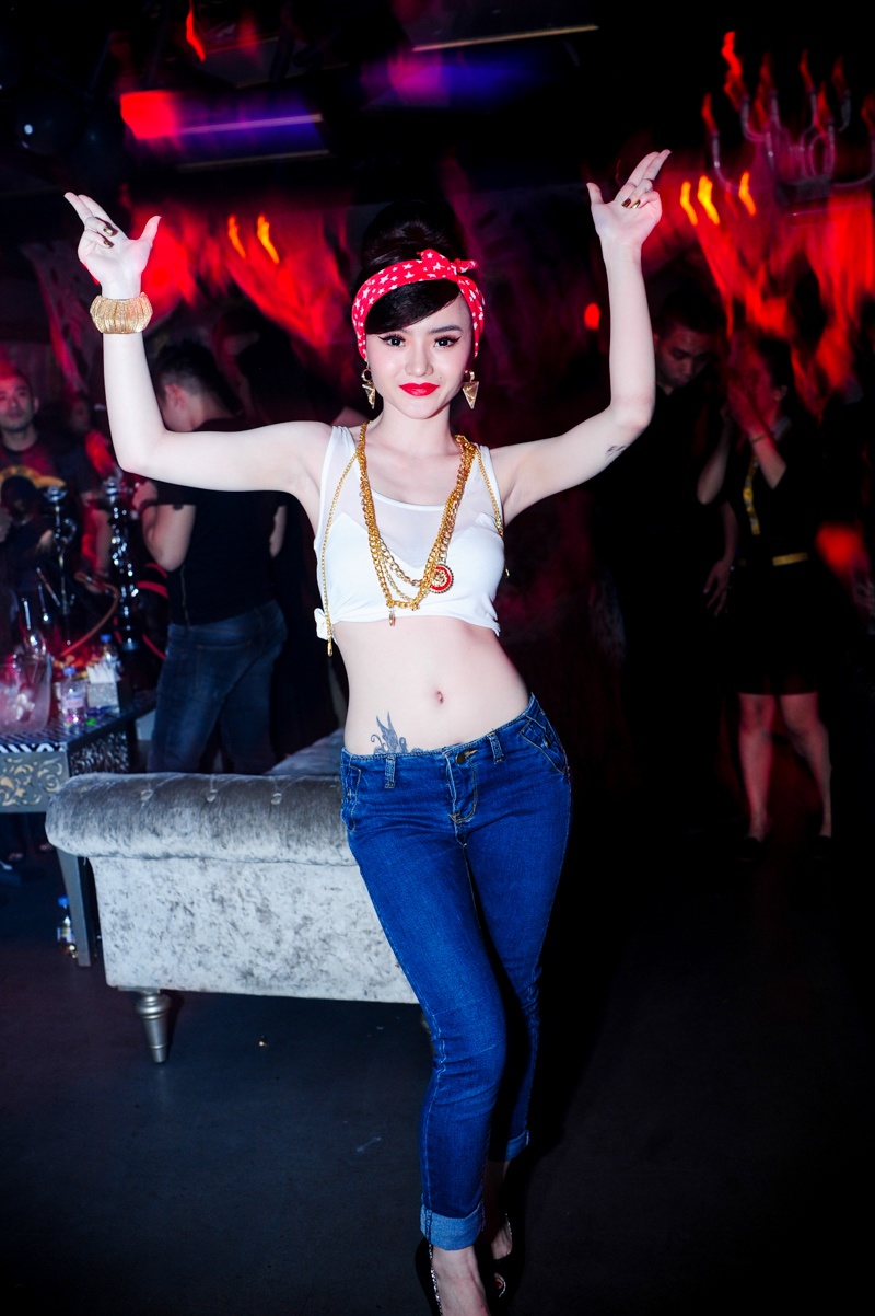 Đi chơi cùng chị em Phương Trinh - Phương Trang trong đêm Halloween còn có hot girl Kelly. Kelly cũng táo bạo khoe vòng một trong chiếc váy xẻ sâu.