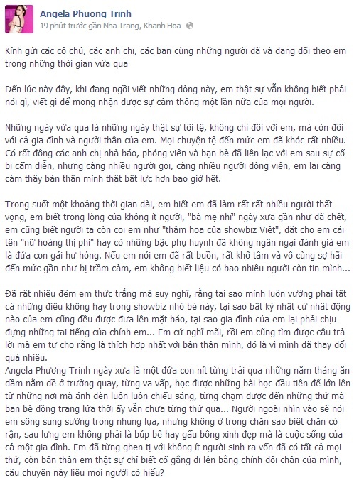 | Tâm thư của Angela Phương Trinh trên trang cá nhân cách đây ít phút. |