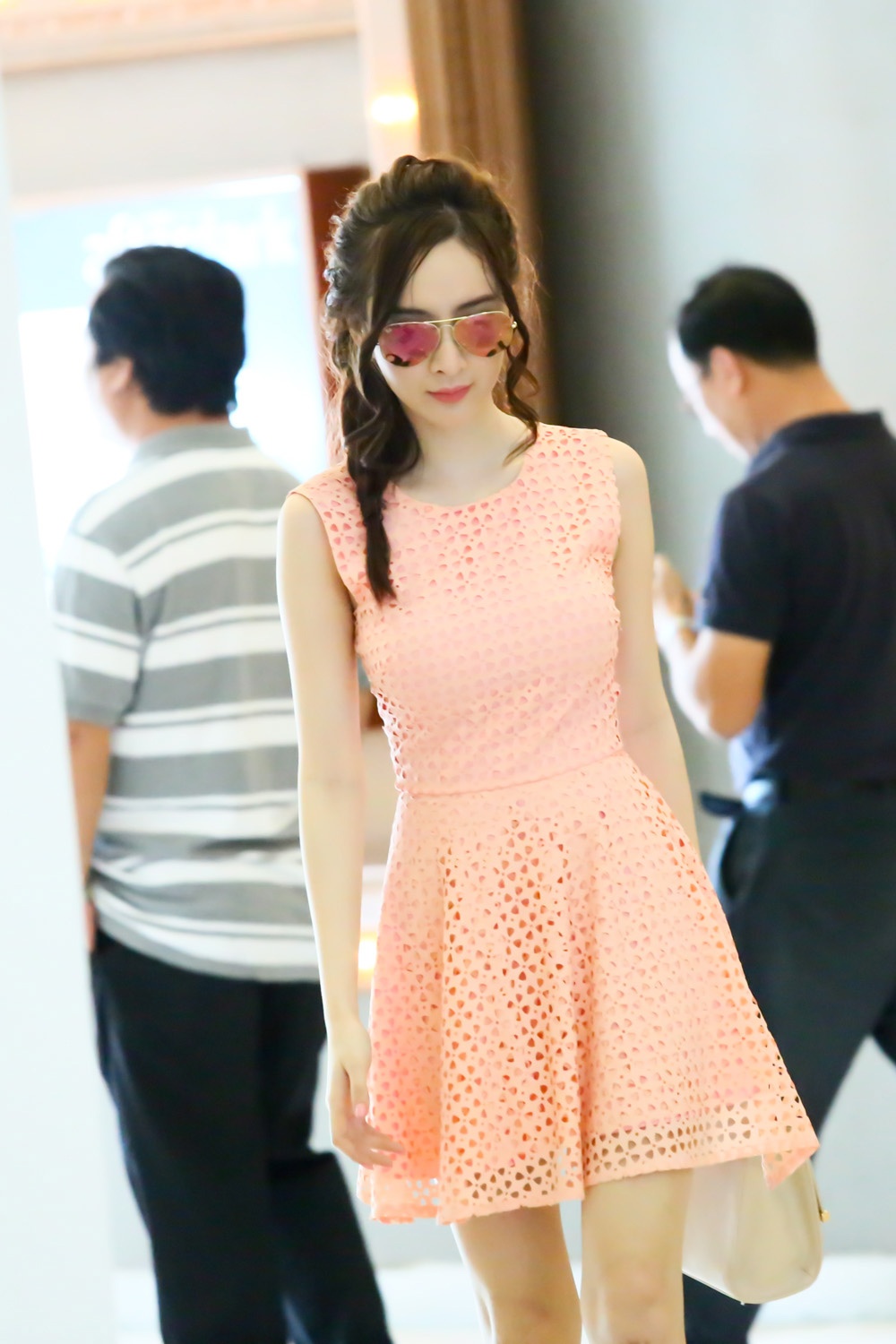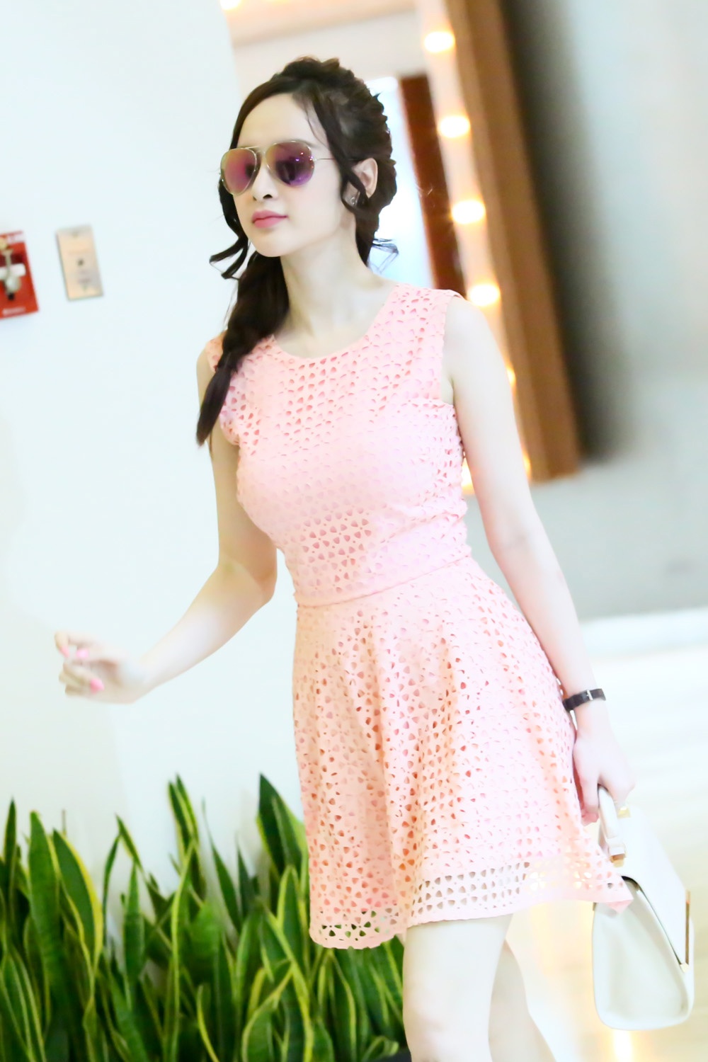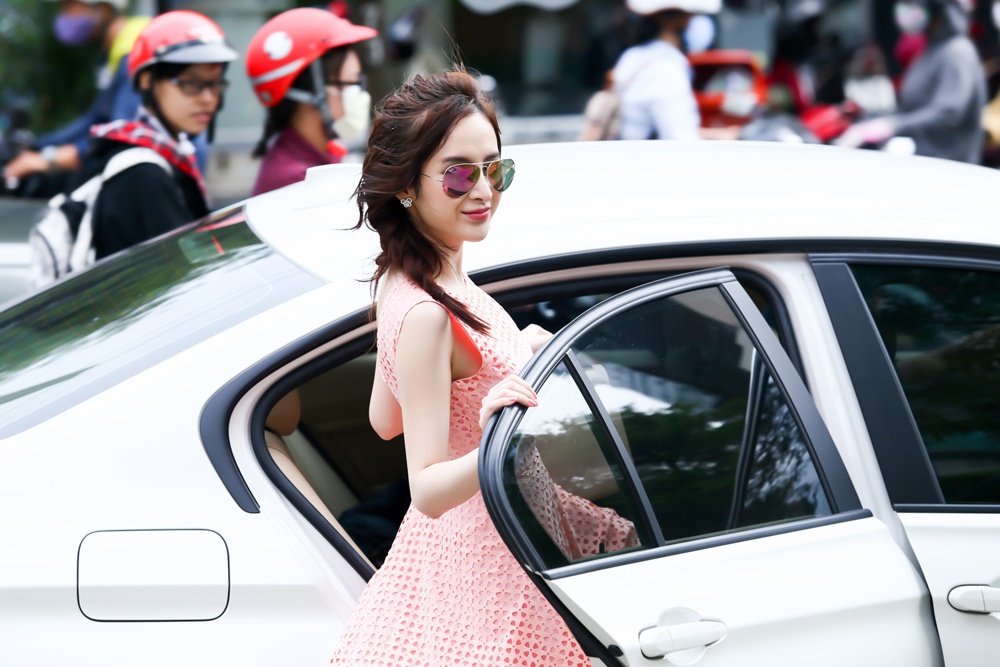 | Trưa ngày 11/7, Angela Phương Trinh được tài xế chở đến một tòa nhà ở trung tâm TP.HCM bằng xế hộp riêng. Người đẹp 19 tuổi thu hút sự chú ý khi diện váy hồng pastel xuống phố. Gout thời trang thanh lịch làm tôn làn da trắng hồng của Angela Phương Trinh. |