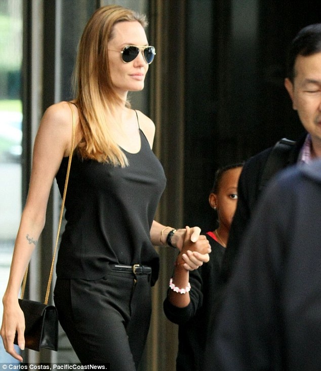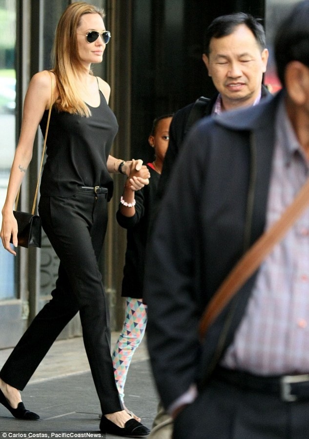 | Minh tinh Hollywood diện trang phục màu đen đồng bộ quen thuộc, vốn là gam màu yêu thích của cô. Angelina mặc quần tây, áo hai dây khoe vòng 1 căng đầy không được che chắn bởi áo lót. Mặc dù trải qua cuộc phẫu thuật cắt bỏ phần ung thư vú hồi đầu năm nhưng vòng 1 của Angelina vẫn đầy đặn, gợi cảm. |