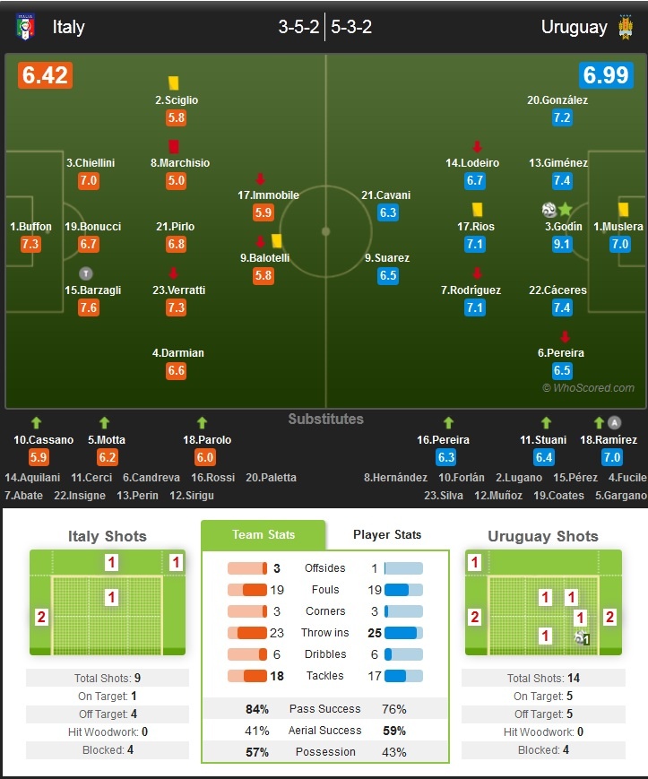 Ở trận đấu diễn ra cùng giờ, chỉ cần một kết quả hòa trước Uruguay, Italy sẽ chính thức giành quyền đi tiếp. Tuy nhiên, đây không phải là nhiệm vụ đơn giản đối với Azzurri, bởi đại diện Nam Mỹ đang có sát thủ đặc biệt nguy hiểm trong tay mang tên Luis Suarez.