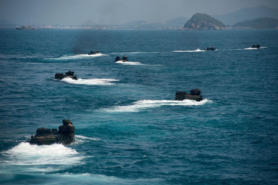 Phương tiện lội nước của Thủy quân lục chiến Mỹ di chuyển theo đội hình trên biển. |