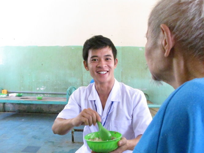 Vừa đút ăn cho một bệnh nhân lớn tuổi bị mù, Nam vừa ân cần trò chuyện với ông. “Ông há miệng đi, cháu đút ông ăn nè. Hôm nay ông ăn thấy ngon miệng không?”, thoạt Nam lấy khăn lau mặt cho ông.