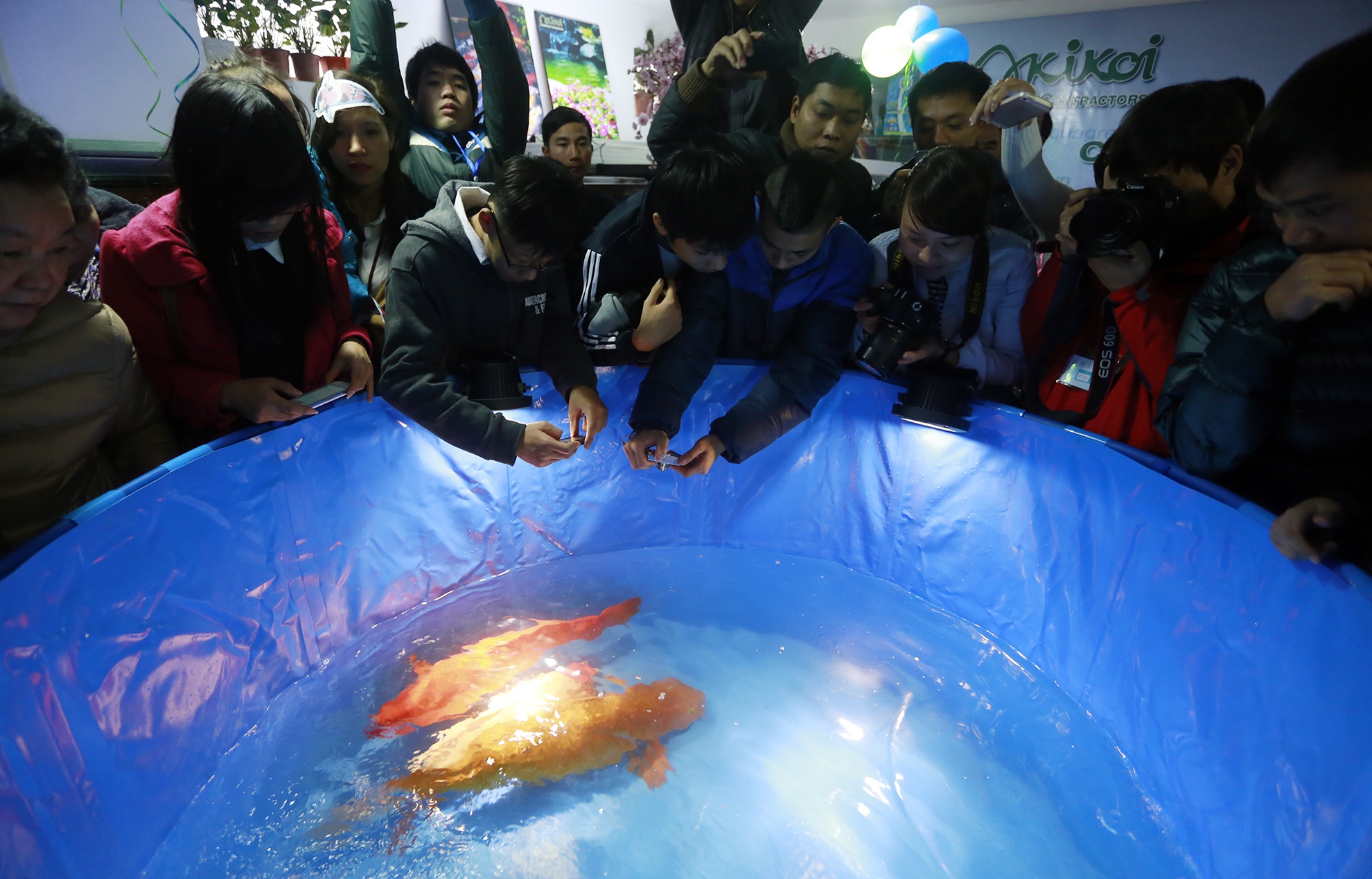 Chú cá Koi 5 năm tuổi, với chiều dài 81cm lấp lánh ánh kim được lấy về từ Nhật Bản bên cạnh những con cá trăm triệu khác có mặt tại Hà Nội.
