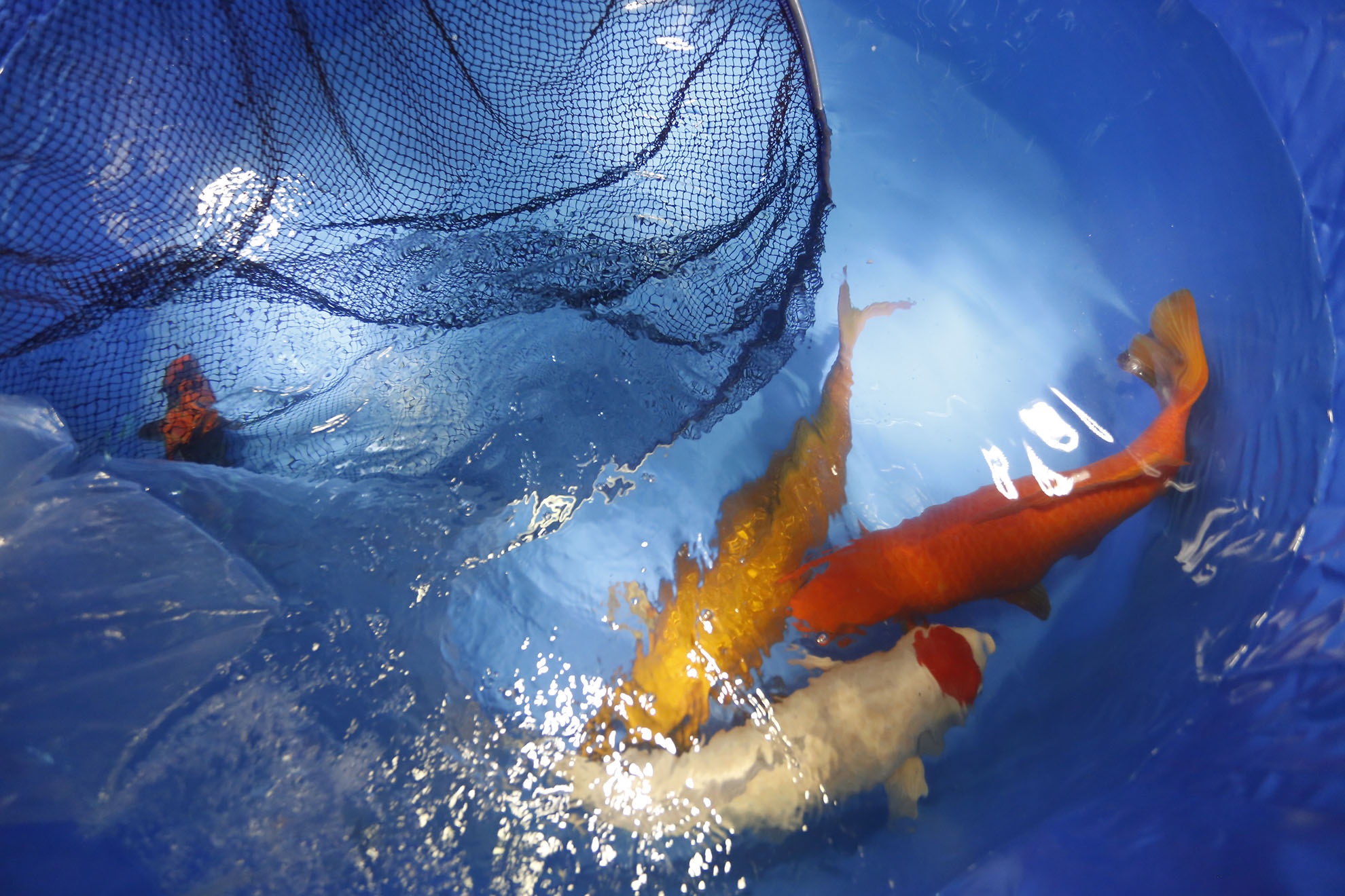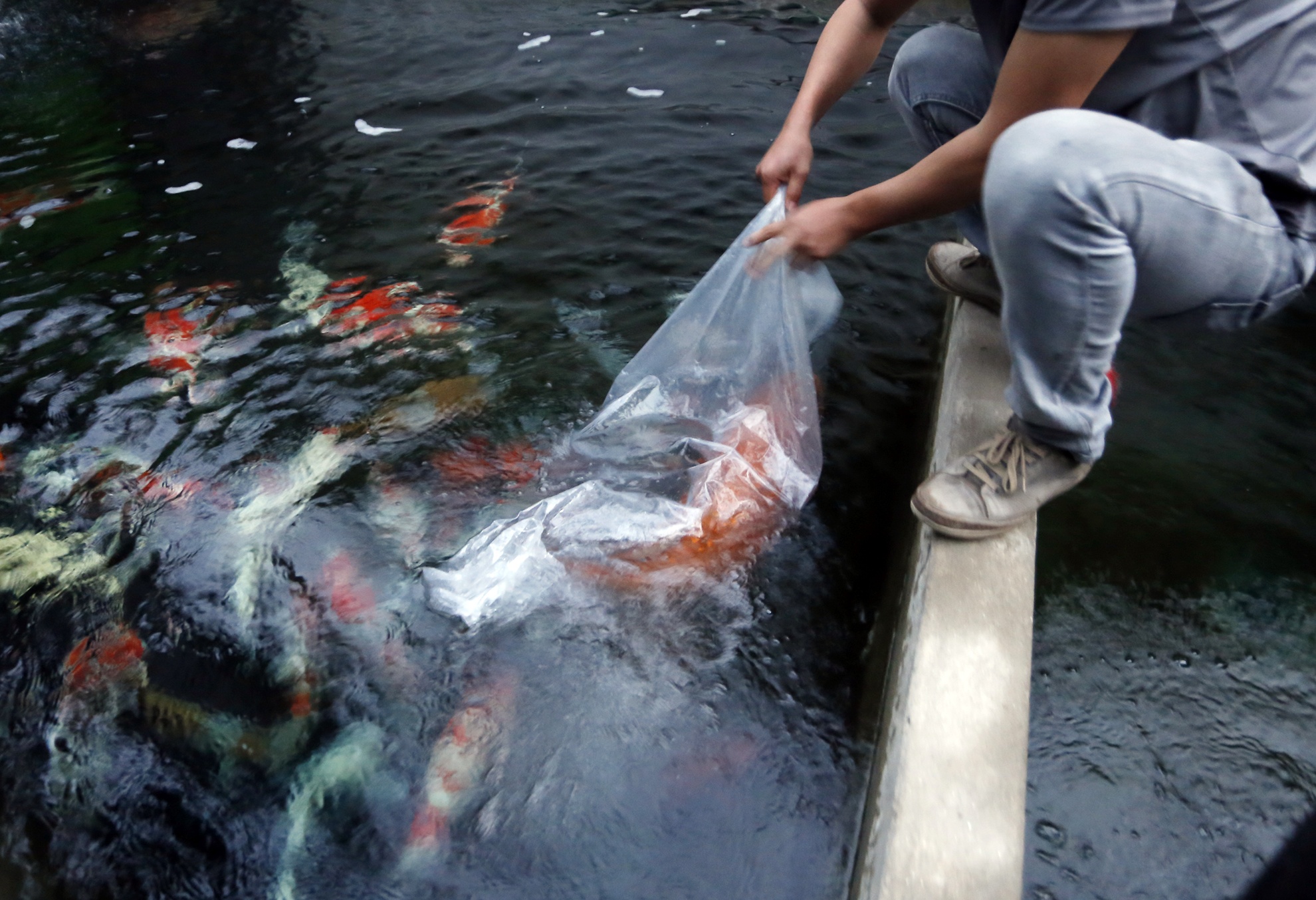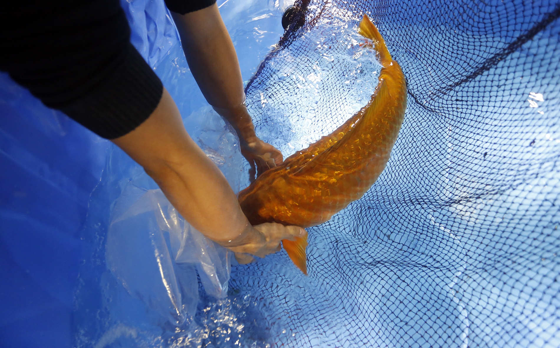 Các nhân viên của trung tâm Akikoi đưa Ginrin về ao cá của mình.