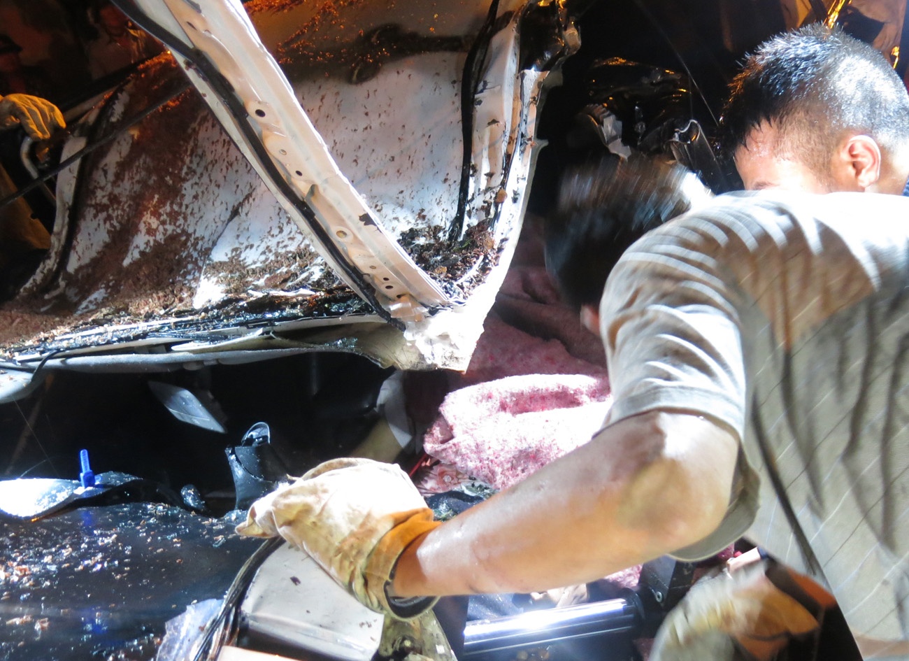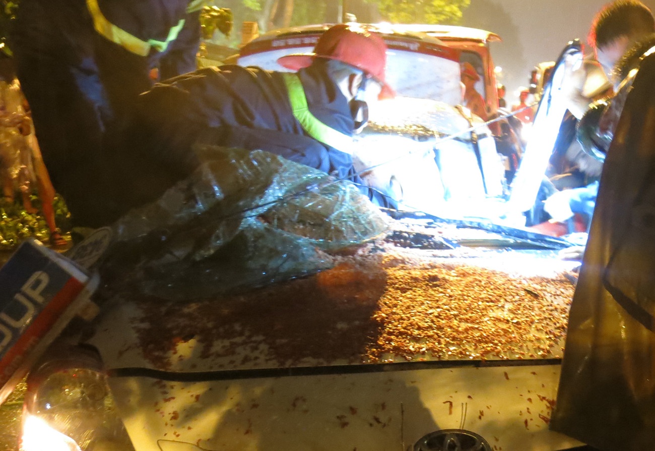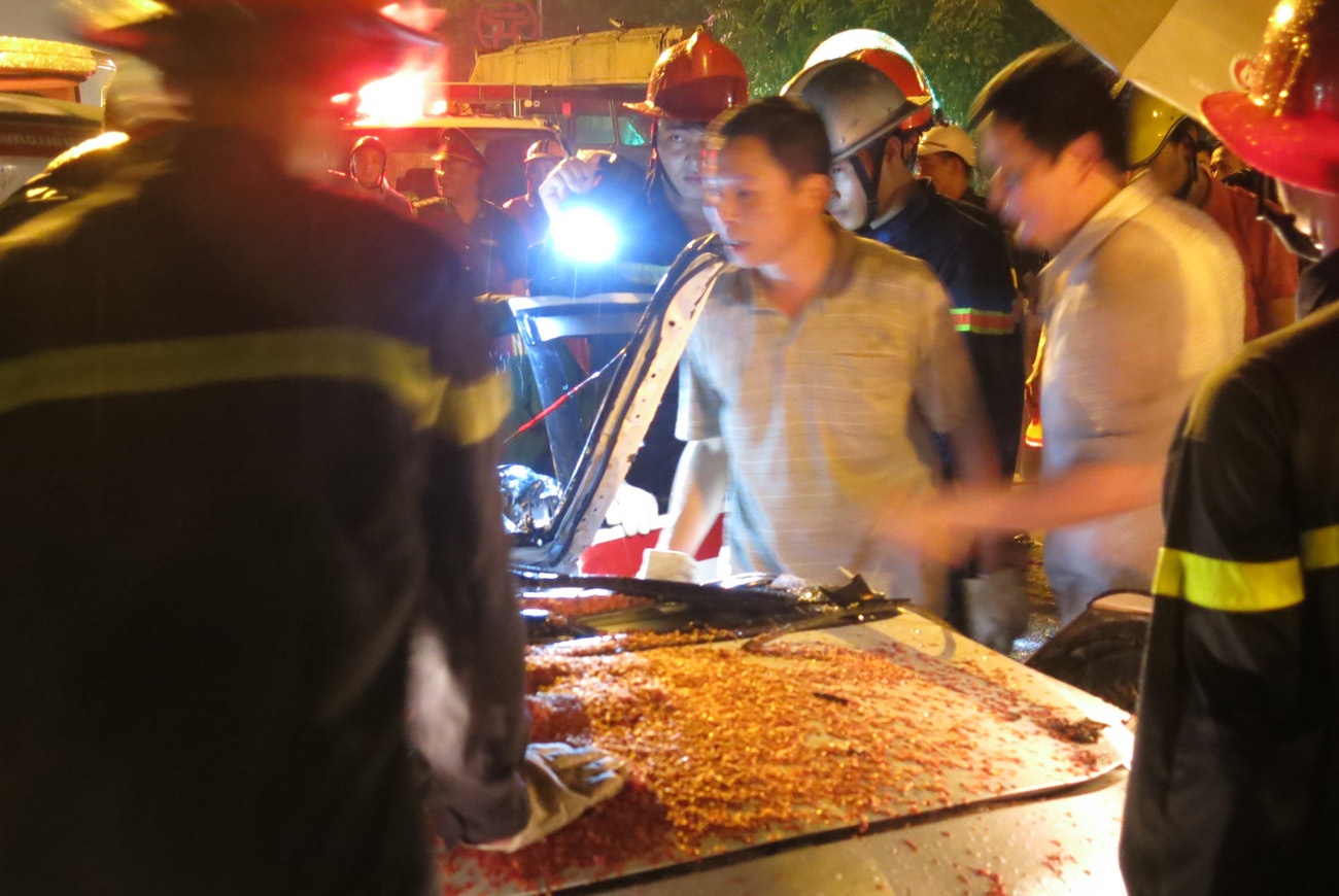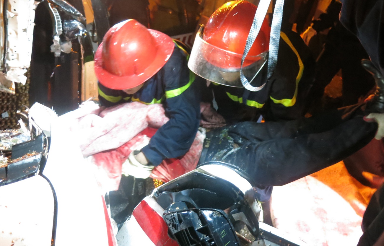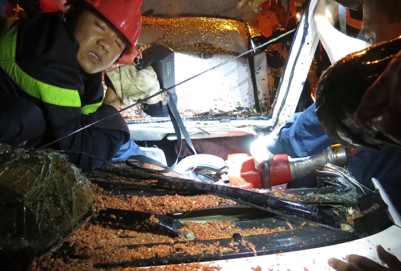 Lực lượng chức năng ngắt điện ắc quy để tránh chập cháy phương tiện, cắt rời thành, khung để bật tung trần xe. Cảnh sát PCCC dùng kìm thủy lực, máy cắt để tháo cửa lái, gỡ vô lăng kẹp chặt xác nạn nhân.