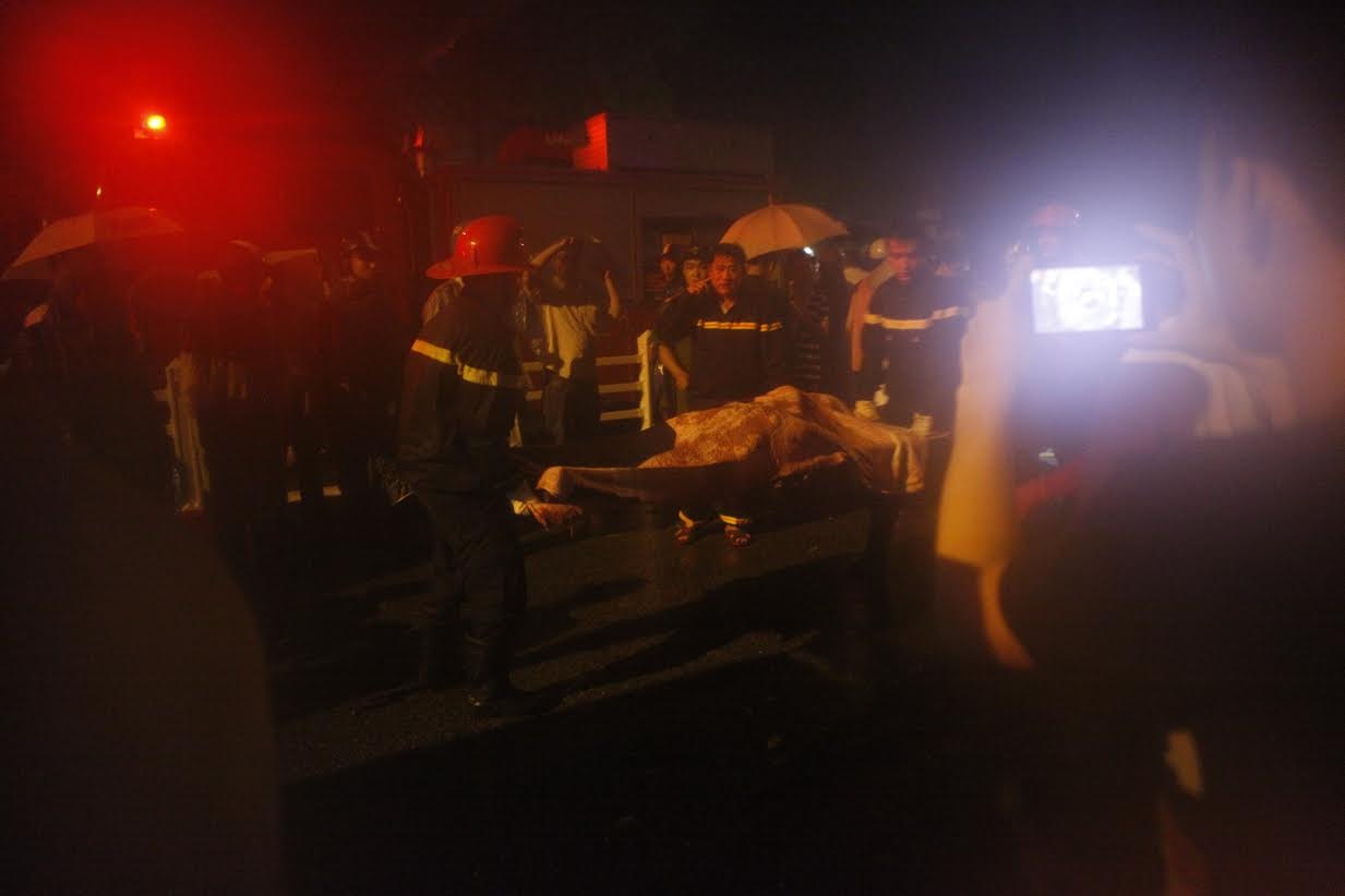 Sau nửa giờ cắt phá vỏ xe, xác nạn nhân xấu số được đưa ra ngoài...
