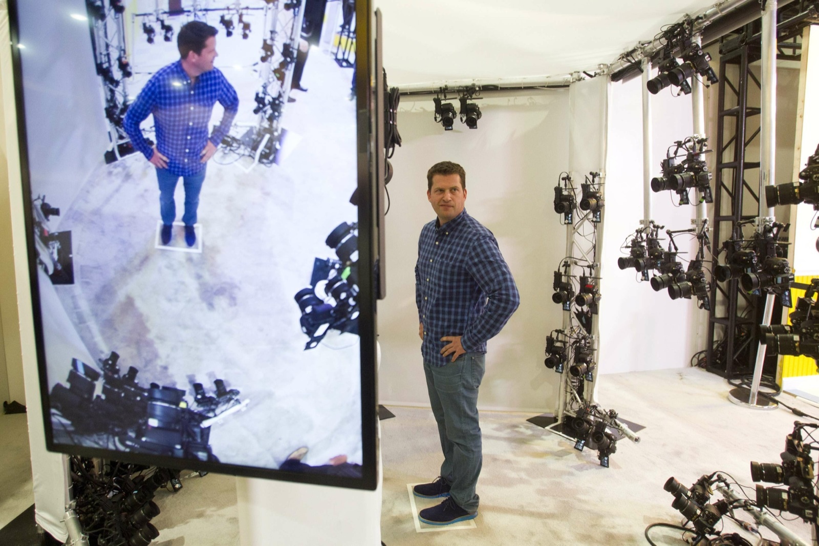 | Một người tham dự đang đứng trong gian hàng sử dụng 68 máy ảnh của Nikon. Các ảnh chụp sẽ được xử lý để tạo ra mô hình 3D của đối tương và đưa vào game video trên máy tính. Ảnh: Reuters. |