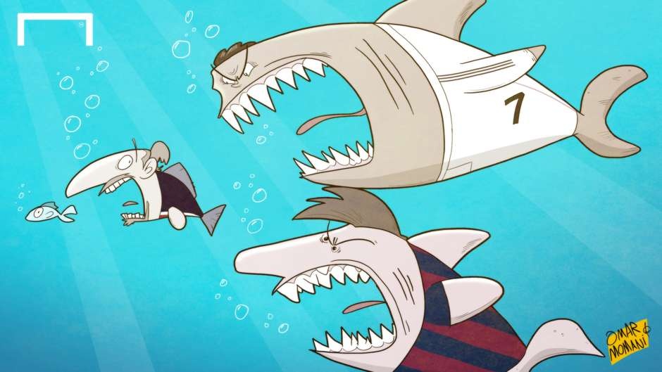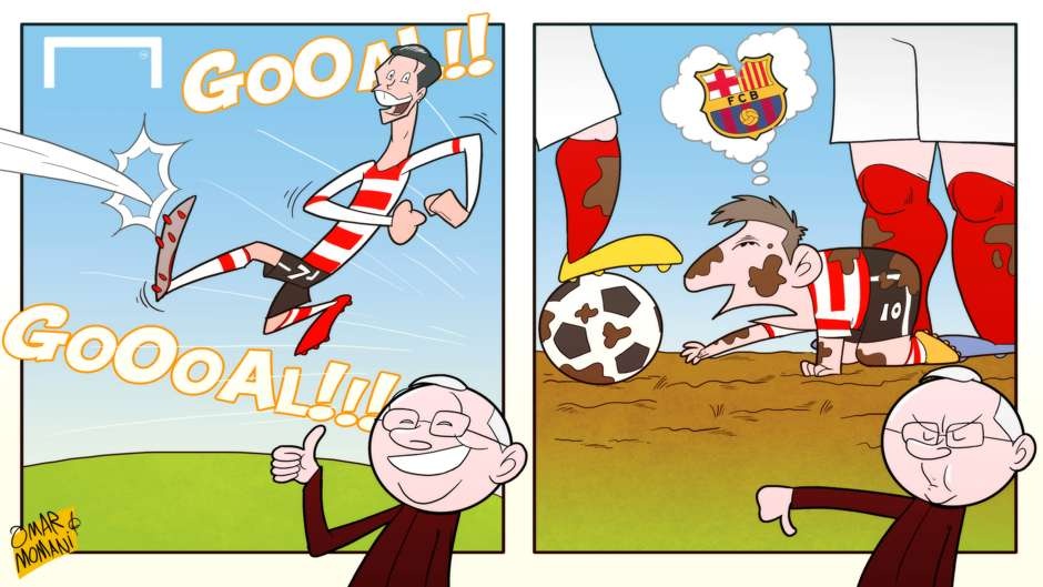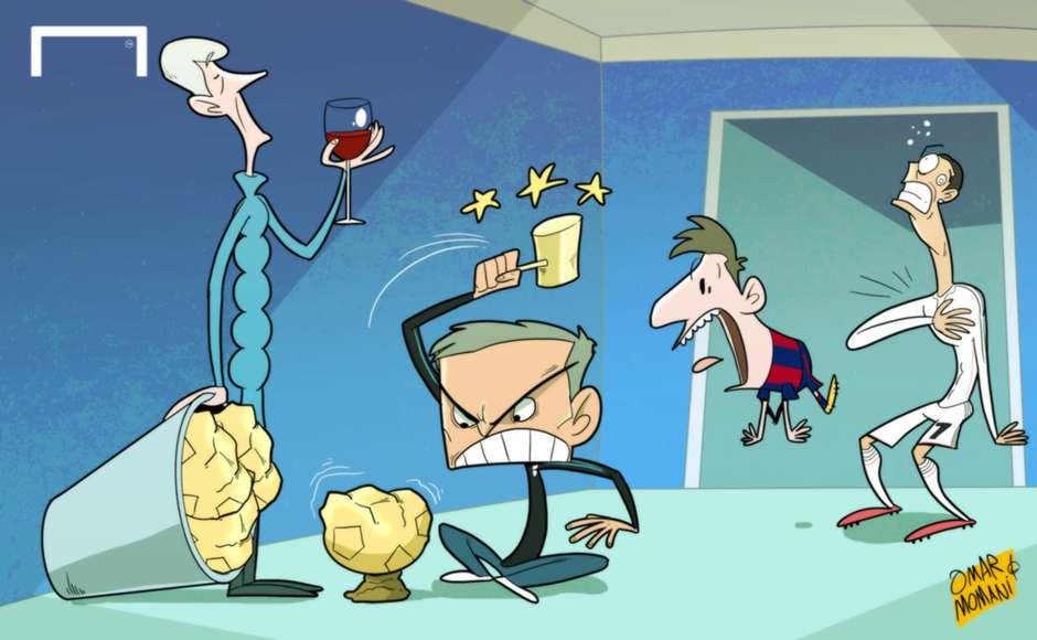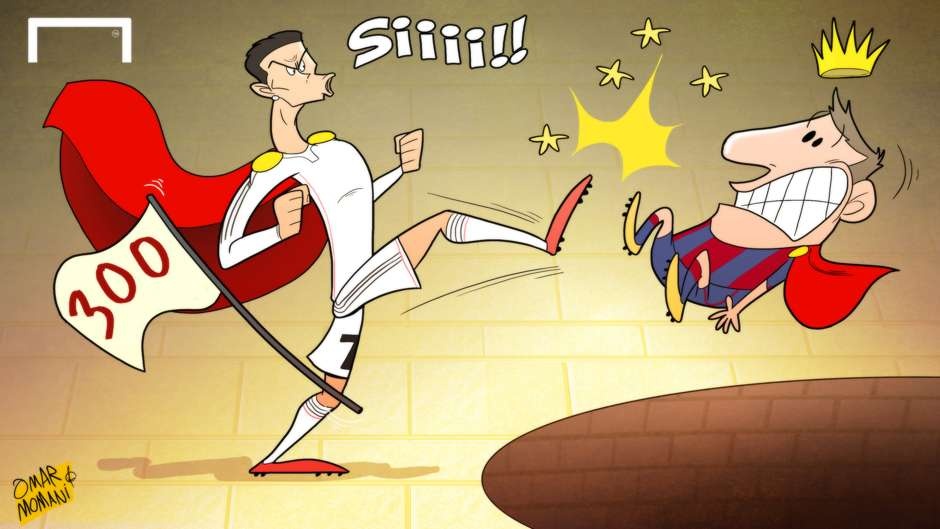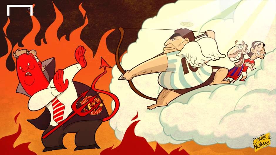 Ribery chỉ trích Van Gaal, Messi cán mốc 400 bàn thắng hay Sir Alex đánh giá Ronaldo cao hơn Messi là cảm hứng giúp họa sĩ Omar Momani cho ra mắt những tác phẩm hài hước.
